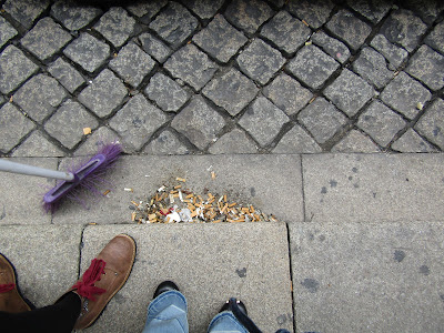 Já assisti a esta cena, que hoje fotografei, inúmeras vezes. Aliás, eu própria, irritada por abrir a porta de casa e deparar-me com o esterco chão, já peguei inúmeras vezes na vassoura e varri o espaço público pensando que estou a fazer um trabalho para o qual não fui mandatada e muito menos fui paga. Pelo contrário, penso que quando descontamos taxas, taxinhas e taxonas será também para a manutenção de um espaço público limpo e asseado... ou não será?