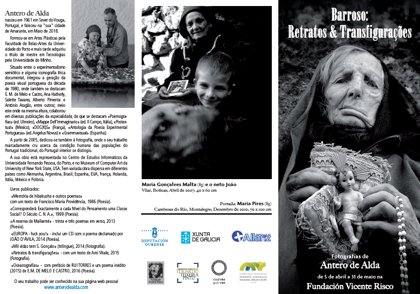 Aqui vos deixo o cartaz, o flyer e o convite para a inauguração da exposição de fotografia de Antero de Alda que ocorrerá no próximo dia 5 de Abril, na Fundação Vicente Risco, em Allariz, Ourense, Espanha.